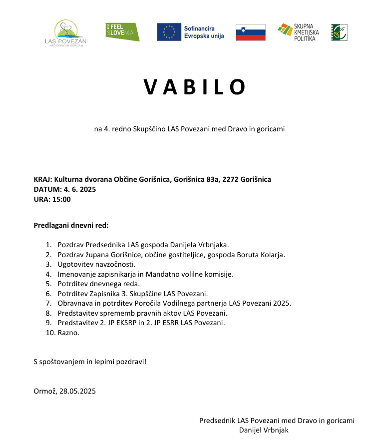 4. SKUPŠČINO LAS POVEZANI MED DRAVO IN GORICAMI, ki bo v Kulturni dvorani Občine Gorišnica, Gorišnica 83a, 2272 Gorišnica.